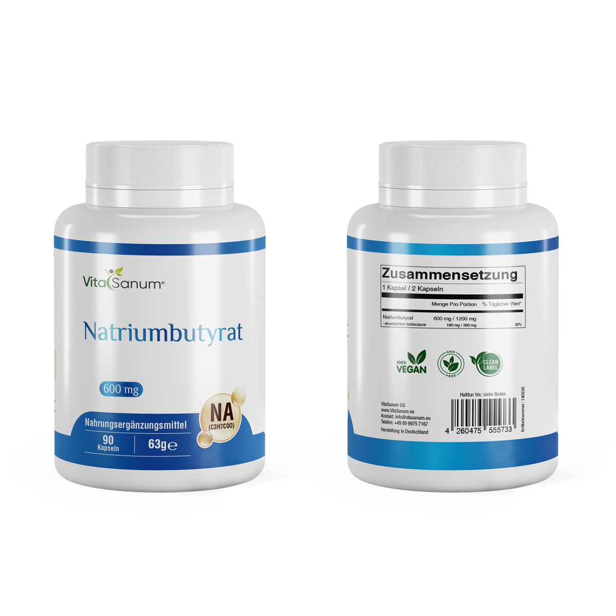 VitaSanum® Natriumbutyrat liefert 600 mg einer Salzform der kurzkettigen Fettsäure Butyrat, die natürlicherweise im menschlichen Darm durch die Fermentation pflanzlicher Ballaststoffe entsteht.